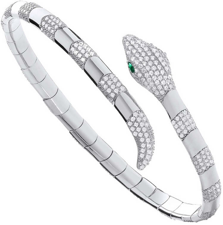 Exude bold elegance with this captivating snake-inspired bangle. Crafted from silver, this sleek 4.7mm wide design is adorned with shimmering cubic zirconia for added sparkle. The intricately detailed snake head, measuring 8.2 x 14.9mm, is the centerpiece, complete with lifelike scales and a green stone for the eye.