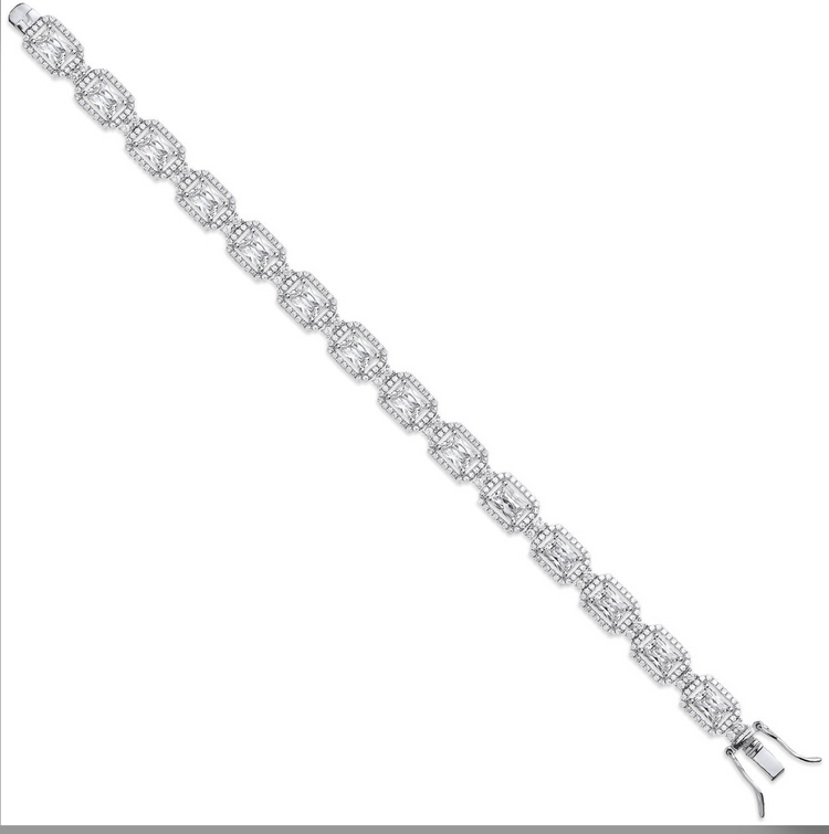 Silver Clear CZ Emerald Cut in a Halo Style Tennis Bracelet