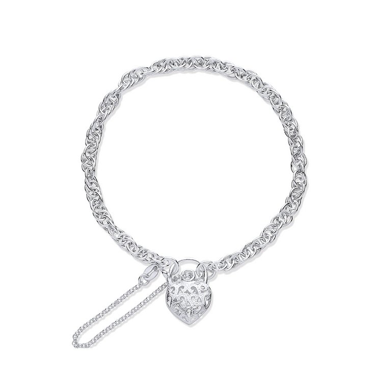 The Silver Padlock Charm Bracelet with Safety Chain combines security and style in a beautifully crafted piece. Featuring a charming padlock design and a safety chain for added security, this bracelet is crafted from high-quality silver and offers a chic, contemporary look.