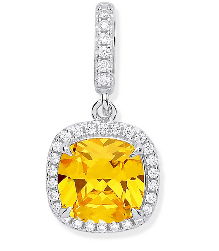 Brighten your jewellery collection with this exquisite Silver Yellow CZ Drop Pendant. Featuring a radiant 8.0 x 8.0mm yellow cubic zirconia at its centre, this pendant is encircled by a halo of sparkling stones that enhance its brilliance. The high-polish silver setting and elegant bale design add a touch of refinement to this vibrant piece.